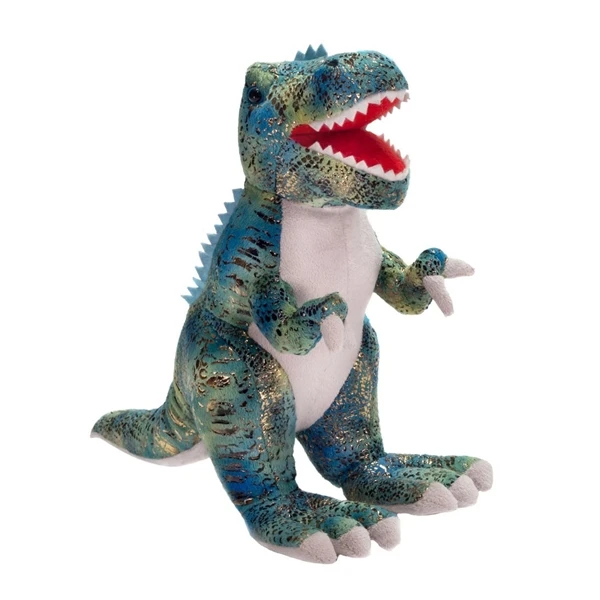 The King of the Lizards had around 60 razor sharp teeth in his fearsome mouth, and while the Blue Glitter T-Rex Stuffed Animal 19 Inch Dinosaur by Fiesta has her mouth open and her gnashers on display, theres a lot less than 60 and theyre not at all sharp, either; in fact, they are made from a soft felt material thats as soft and unthreatening as the rest of this pretty plush T-Rex. At around 19 inches, the Blue Glitter T-Rex Stuffed Animal 19 Inch Dinosaur by Fiesta has a mottled bluey-green skin with metallic foil scales that shimmer and shine in the light, adding a bit of bling to her cuddly, cozy faux fur appearance. Those felt teeth we mentioned perfectly match her tummy and claws, too, while her mouth is wide open in a seemingly terrifying pose; if you look closely, though, you will see that this stuffed T-Rex is actually just asking for you to take her home with you, while holding her exceedingly short arms out for you to pick her up. Filled with a soft polyester fill that will ensure she will bounce back into shape after even the most vigorous of hugs, the Blue Glitter T-Rex Stuffed Animal 19 Inch Dinosaur by Fiesta will look roarsome at the front of any pack of prehistoric animals, and will look suitably snazzy as a standalone dinosaur stuffed animal, too.