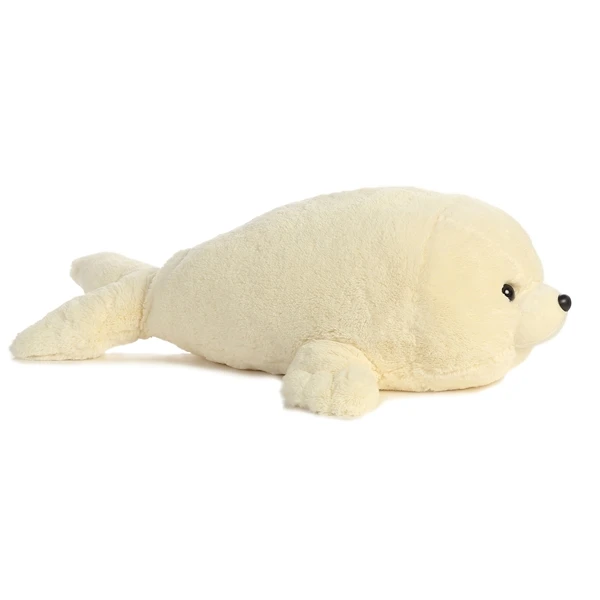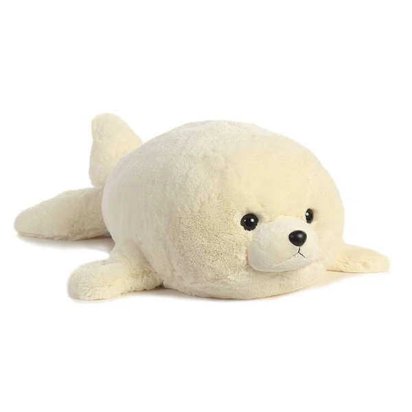 The Jumbo Stuffed Baby Harp Seal Super Flopsie by Aurora is ready to be your new best friend! Measuring thirty inches long, this big plush baby harp seal has soft, bright white plush fur with a cute little black button nose and dark eyes. Our big plush baby harp seal also features a stubby muzzle with a pouty black stitched mouth. It’s short flippers and floppy tail make perfect handles for carrying it around the house! With a lovably blimp-shaped body, you can bet that this baby harp seal stuffed animal is a top notch cuddle buddy. It’s big and bulky body makes a great place to rest your head after a long day of big baby harp seal fun. The best way to describe this big plush baby harp seal is soft, squishy, and more comfy than you can possibly imagine. The Jumbo Stuffed Baby Harp Seal is bean weighted to give it some extra bulk and is durably constructed to enhance its ability to be hugged and loved and squeezed over and over again. When a stuffed animal is this cute, it has to be prepared for to absorb tons of hugs and squeezes!