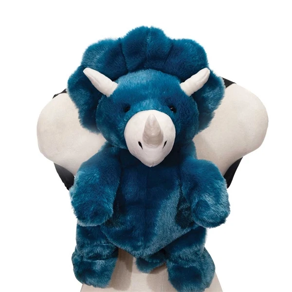 If you dino-saw the Plush Triceratops Dinosaur Backpack by Fiesta on anyone elses back, you would immediately want it for yourself, so why not take the plunge and give him a home before someone beats you to it? Made to stand out from the crowd, this plush Triceratops dinosaur backpack definitely isnt a doyouthinkysaw-us as he is a bright, vibrant blue; there really is no missing him. Measuring approximately 16 inches, the Plush Triceratops Dinosaur Backpack by Fiesta has a fabulous frill around his head that is thankfully as soft as his coat, and a trio of soft horns on his face, too. With two straps that will allow you to wear him securely yet comfortably on your back, this stuffed Triceratops dinosaur backpack is spacious enough for a number of those day to day items that you dont want to carry in your pockets, and will also make a fabulous weekend bag for those sleepover essentials like PJs, toothbrush, and lots and lots of treats. Of course, there will be times when you just need a cuddle rather than someone to carry your possessions, and the Plush Triceratops Dinosaur Backpack by Fiesta will happily oblige in that department, too, as he is cozy and comforting from his head right down to his Tricera-bottom.